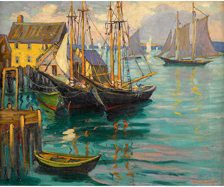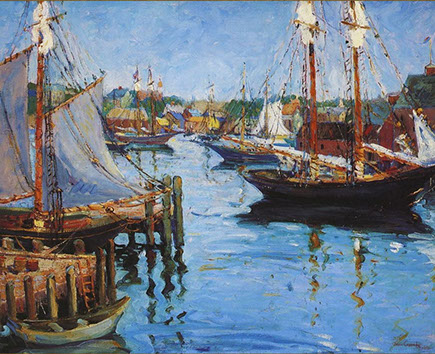“In the waters shown in my paintings, there were a number of lobster traps. The fishermen were so much interested in the development of the picture of this familiar scene that in order to have an excuse to see it they would bring me a freshly boiled lobster, and the old sea captains would entertain me with thrilling stories of stormy nights spent in their little fishing schooners on the Newfoundland Banks and the Georges.”